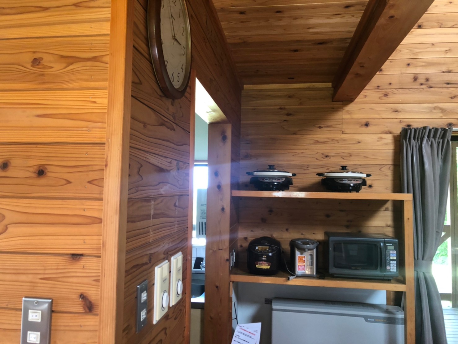 室内設備も充実していて、屋外でのキャンプ目的だけでなく、食材を持ち込めば室内で調理が完結するほど設備が取り揃えてありました。ただし布団はありませんので、寝袋(シュラフ)などの持ち込みが必要です。